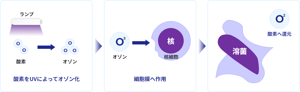 オゾンにより細菌の細胞膜を破壊し細菌を不活性化します。